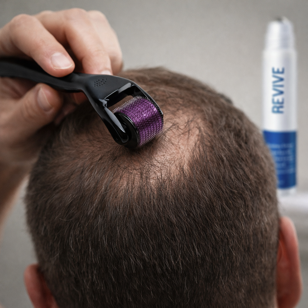 The Halo Roller creates tiny micro-channels in the scalp, gently stimulating circulation and allowing the Revive Accelerator serum to penetrate much deeper than it would on its own. This helps deliver active ingredients directly to the follicles, encouraging healthier growth, reducing thinning, and improving overall scalp health.